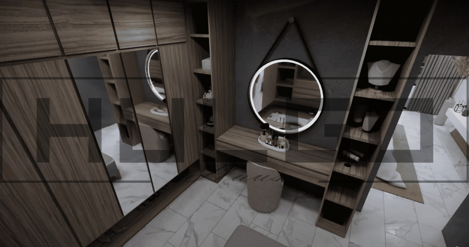 Dressingul adiacent dormitorului principal asigură un spațiu amplu pentru depozitarea și organizarea hainelor, fiind conceput cu rafturi și sertare personalizate pentru a maximiza eficiența și accesul.