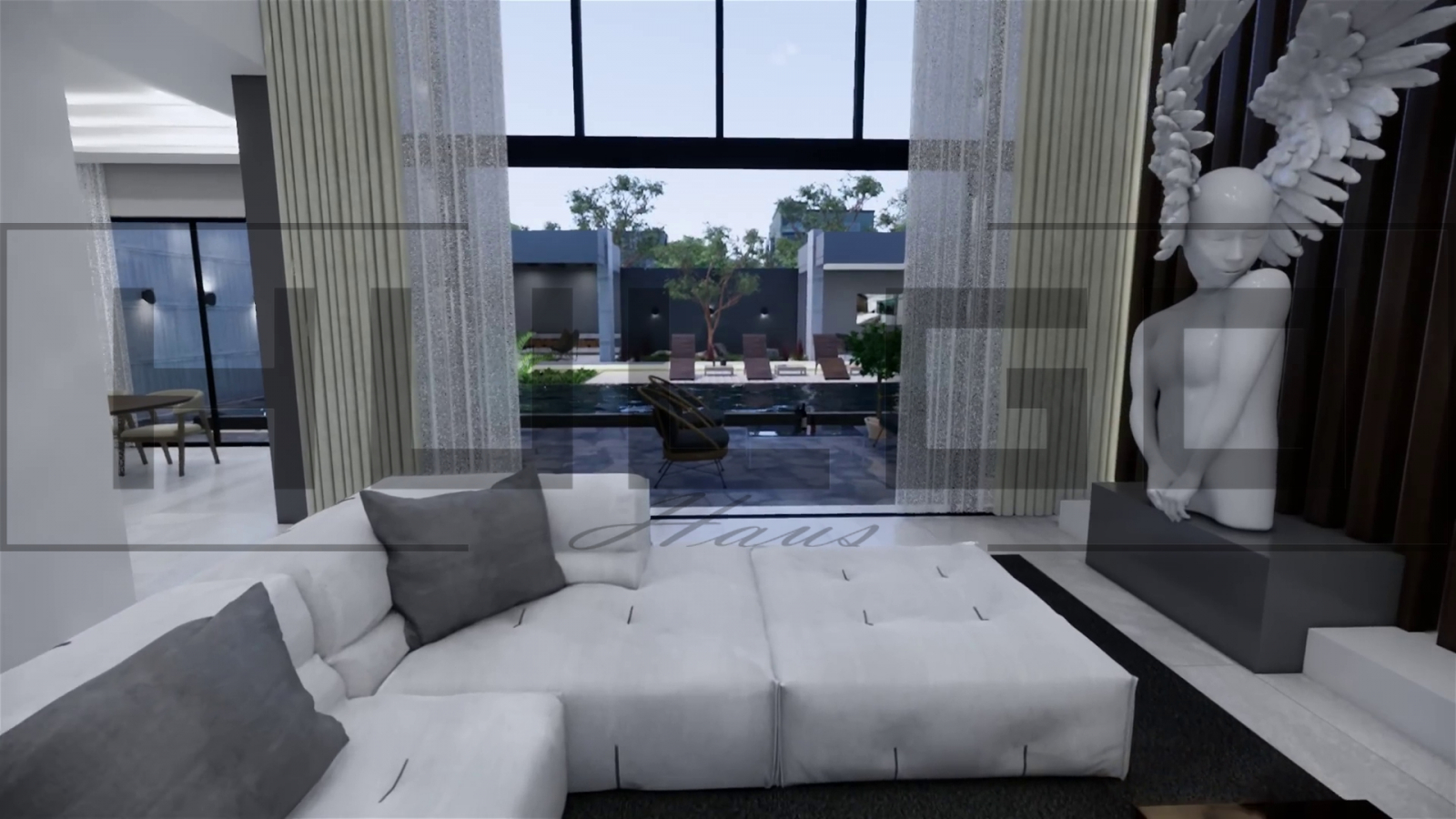 Living Room: O zonă centrală de zi, cu tavan înalt și ferestre panoramice, decorată cu mobilier modern și culori neutre care amplifică senzația de spațiu.