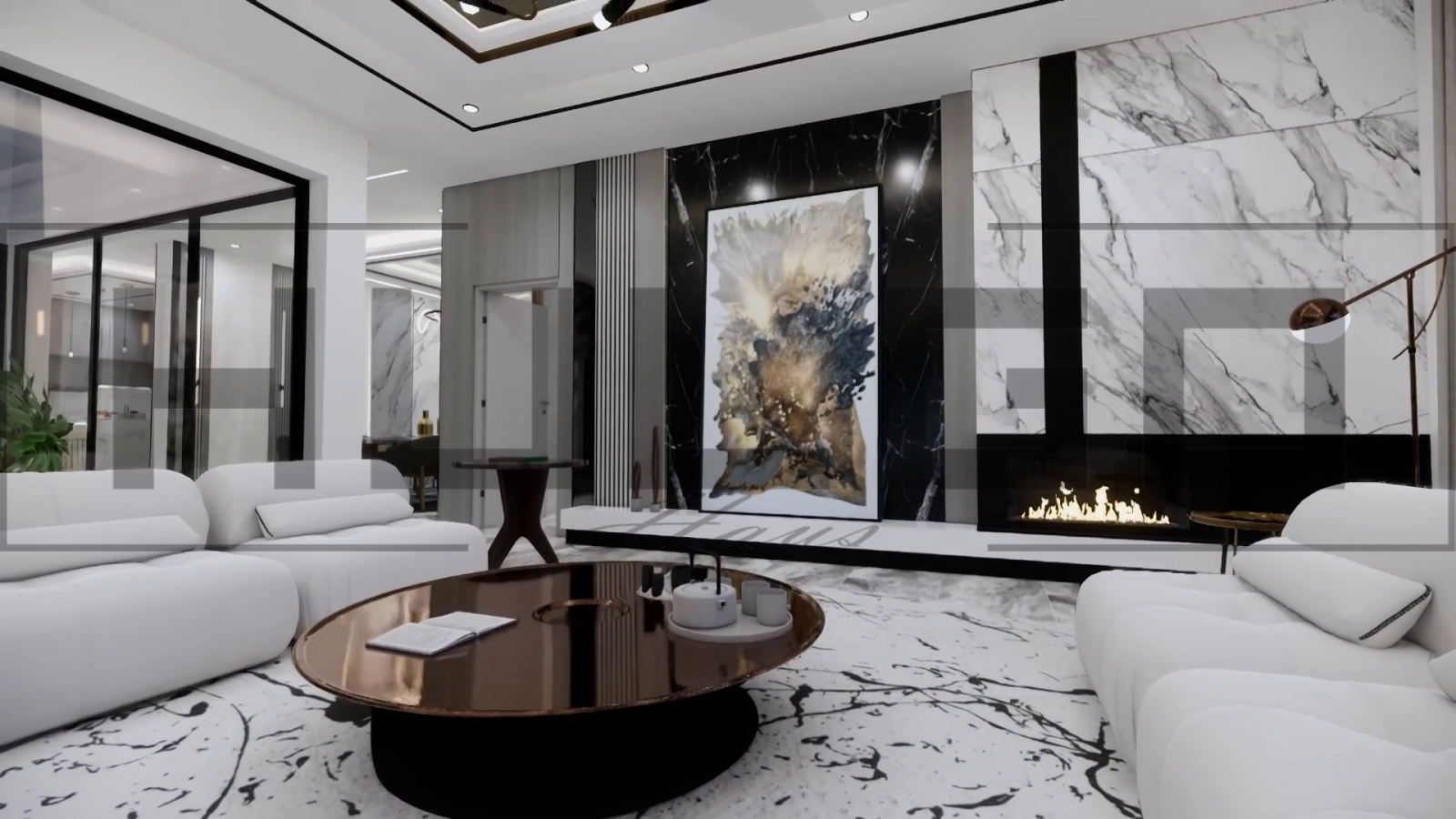 Living-ul principal – Un spațiu deschis, cu ferestre mari care permit luminii naturale să inunde interiorul, creând o atmosferă relaxantă. Zona este mobilată cu piese de design modern, iar elementele decorative contribuie la un ambient elegant.