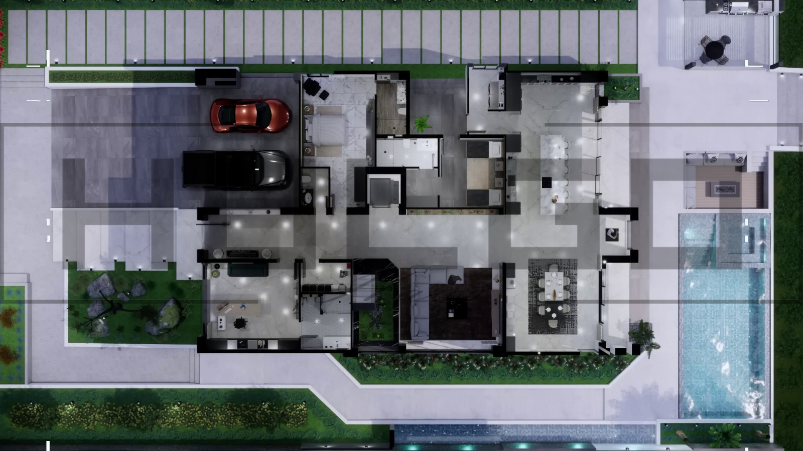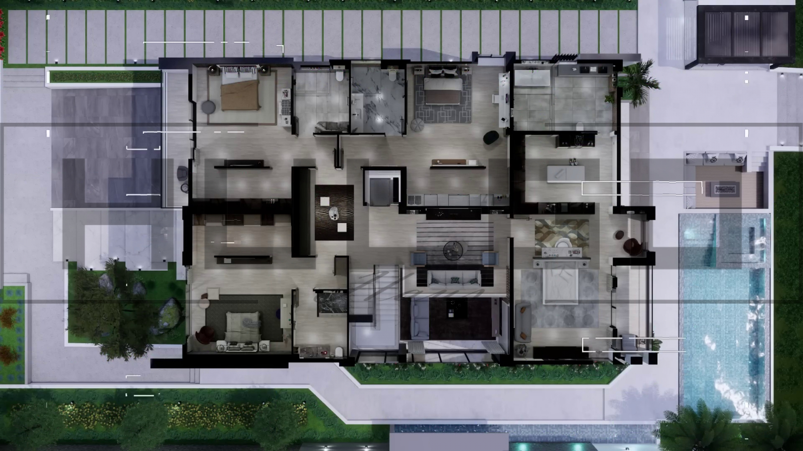 • Piscina de exterior adaugă un plus de rafinament și funcționalitate curții, fiind însoțită de zone de șezlonguri și terasă acoperită.