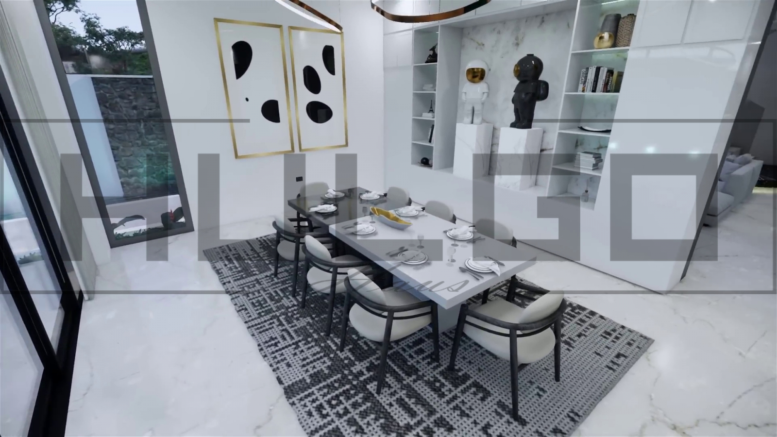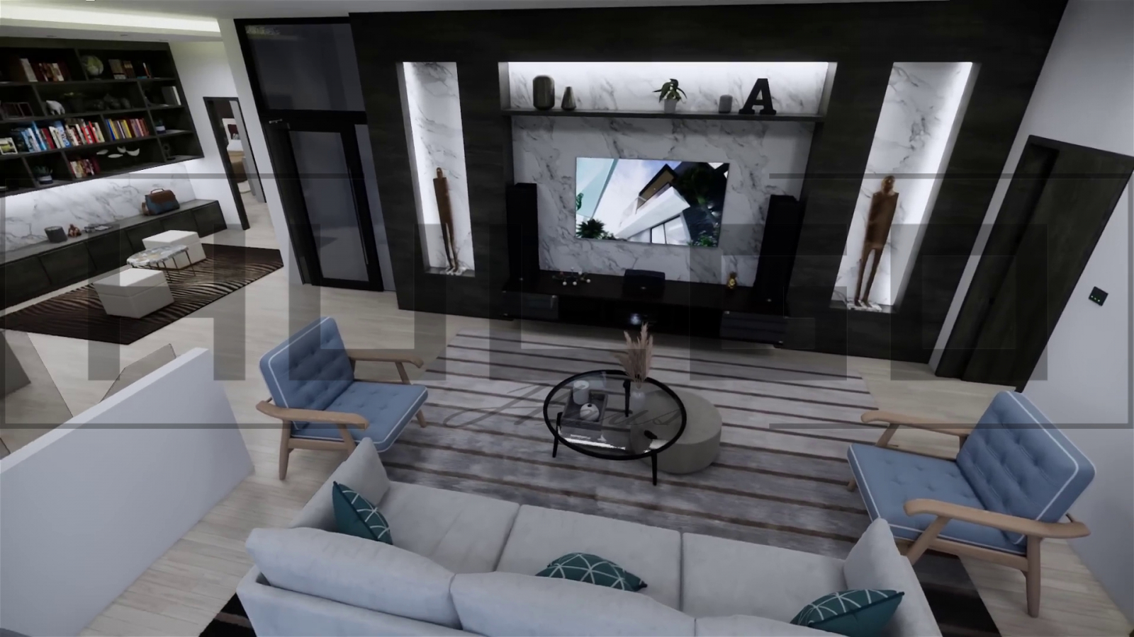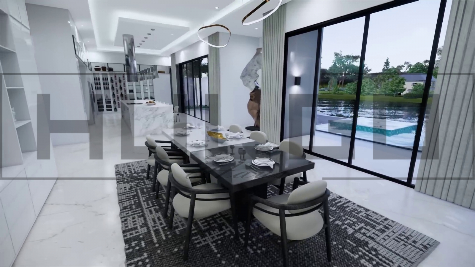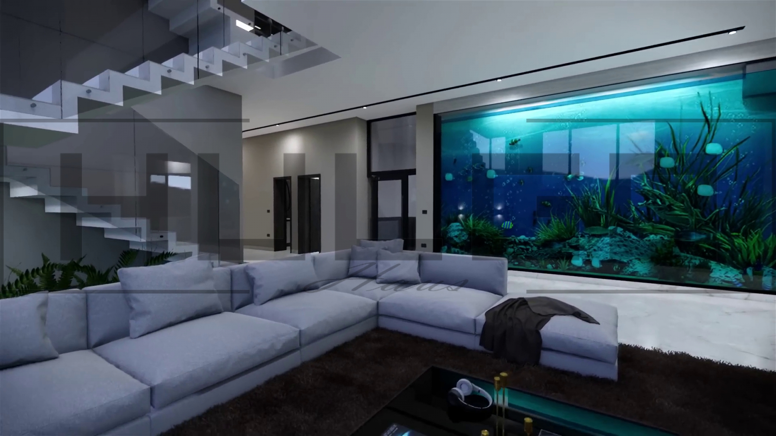 Living principal: Un spațiu vast, decorat modern, cu o canapea modulară și vedere spectaculoasă către piscină. Acvariul integrat oferă un punct focal de eleganță și calm.