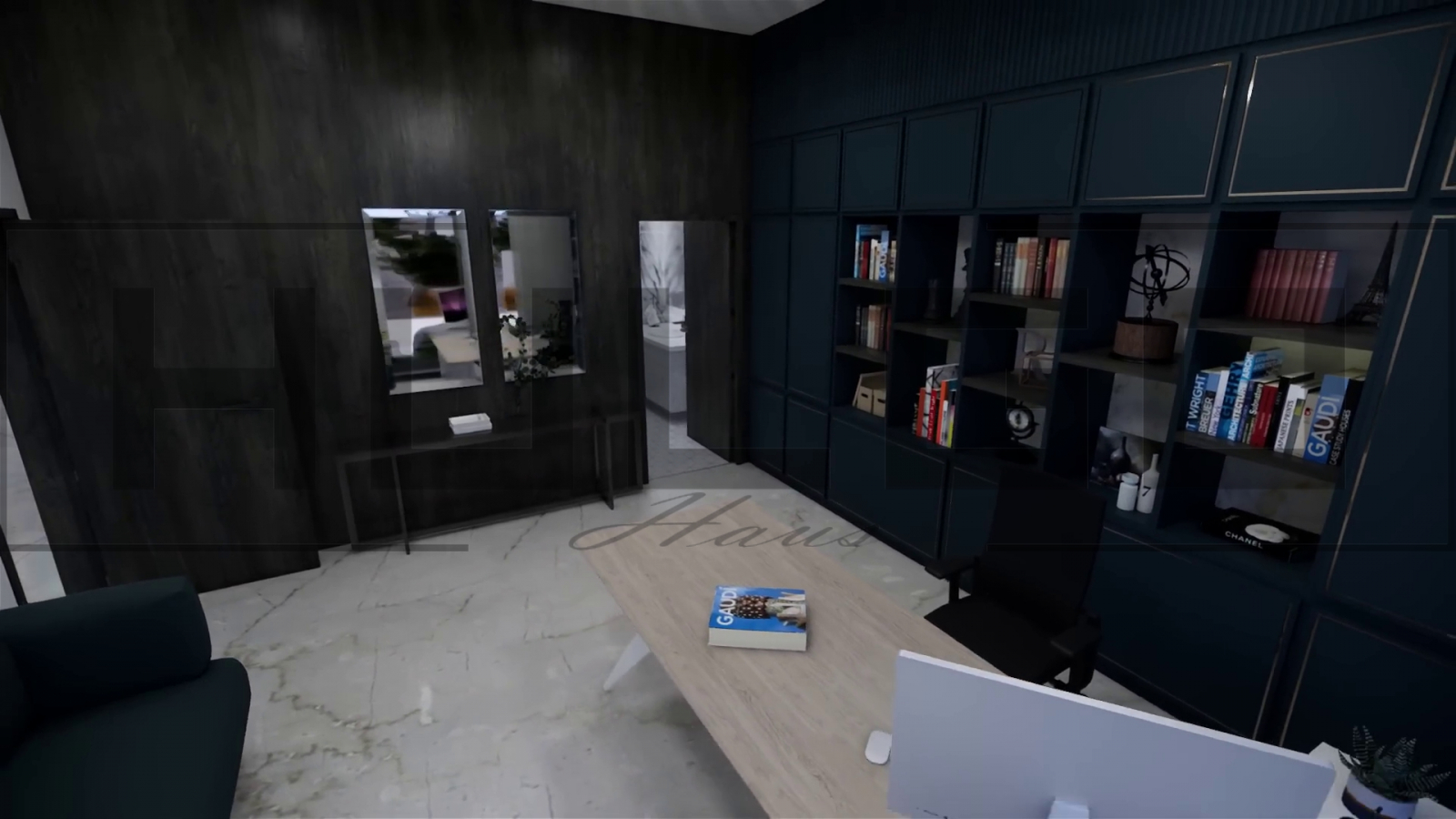 Birou: O cameră de lucru privată, cu spațiu pentru birou, bibliotecă și decor minimalist.