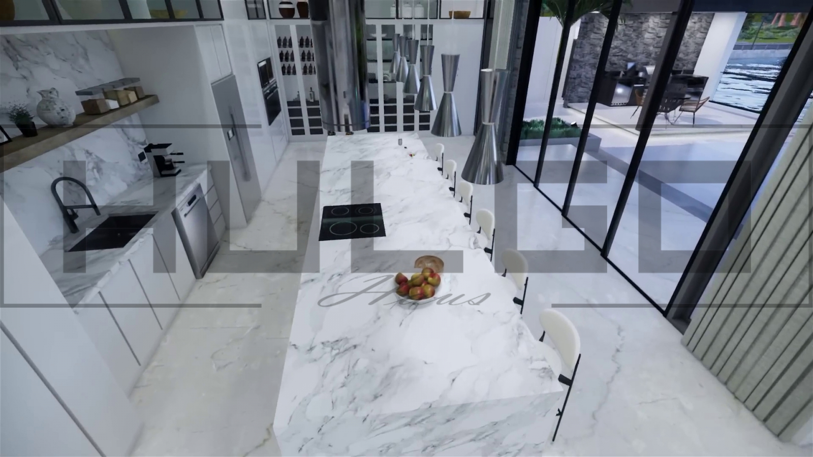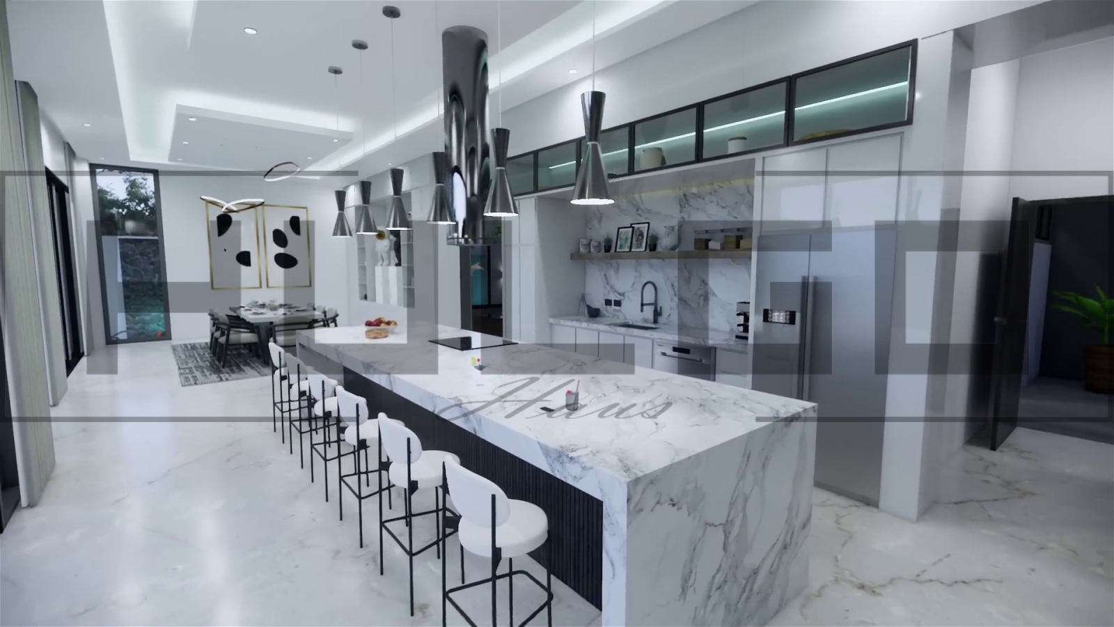 Bucătărie: Bucătărie open-space cu insulă centrală din marmură, dotată cu electrocasnice premium și spațiu de depozitare generos.