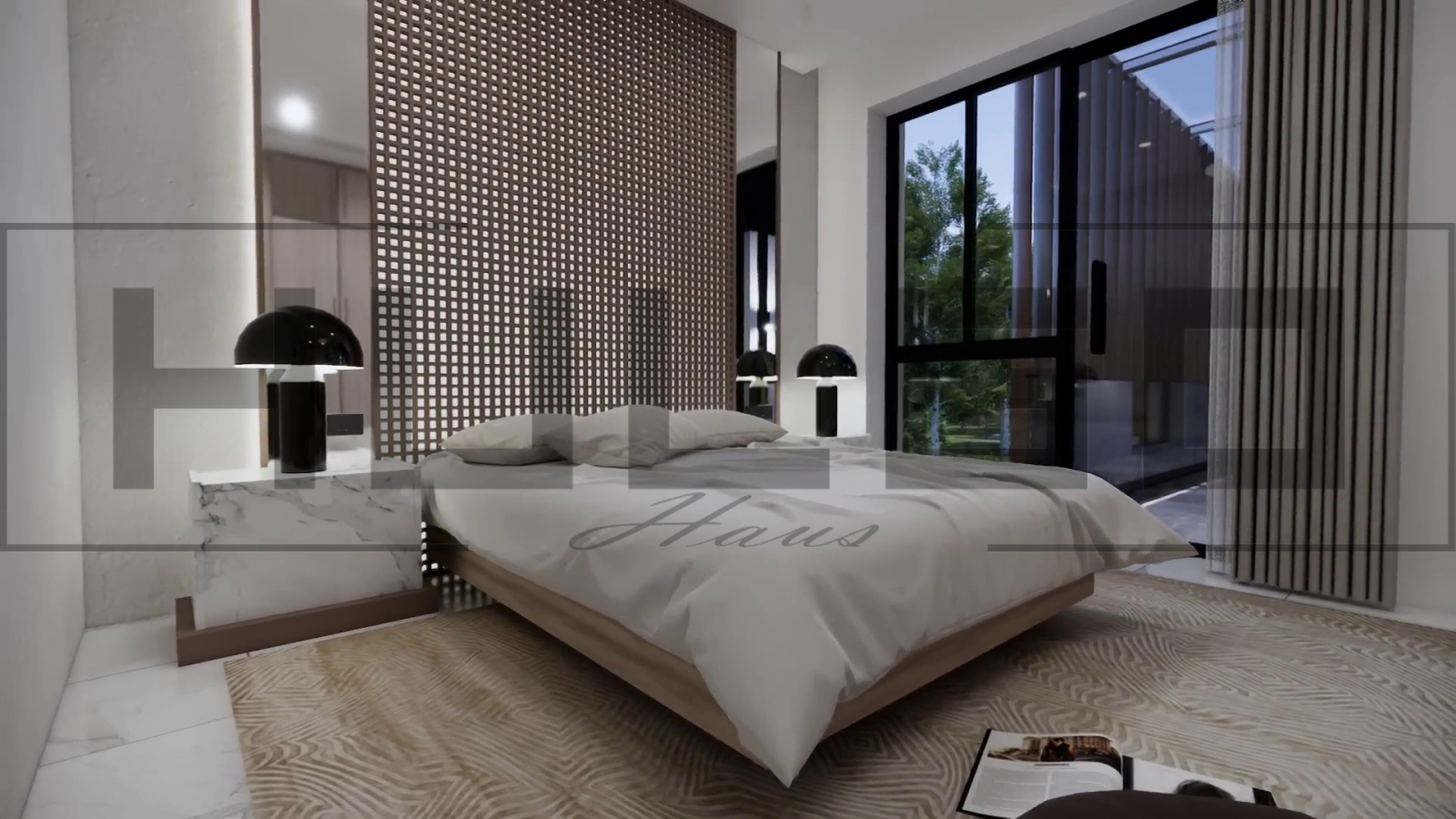 Fațada clădirii impresionează printr-un design minimalist, cu accente geometrice bine definite și combinații de materiale moderne, precum sticlă, beton și finisaje din lemn natural. Elementele decorative, cum ar fi grilajele din lemn și iluminatul subtil, conferă un aer sofisticat. Grădina frontală adaugă un plus de farmec, iar accesul principal este marcat de o ușă impunătoare, perfect încadrată.