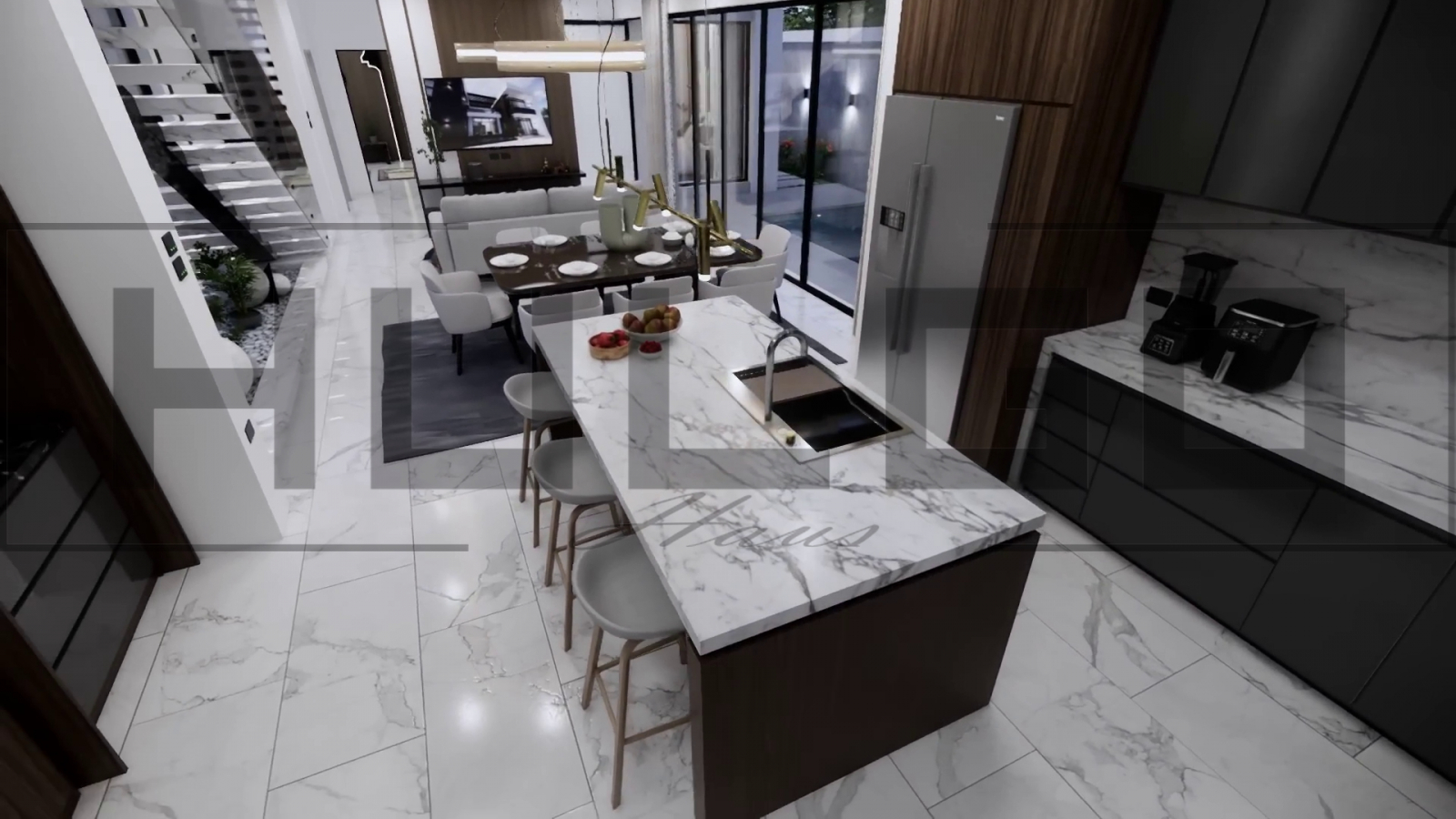 Bucătăria și zona de dining: Bucătăria deschisă, complet echipată, dispune de o insulă centrală multifuncțională. Zona de dining adiacenta este perfectă pentru mesele de familie, având vedere către grădina din spate.