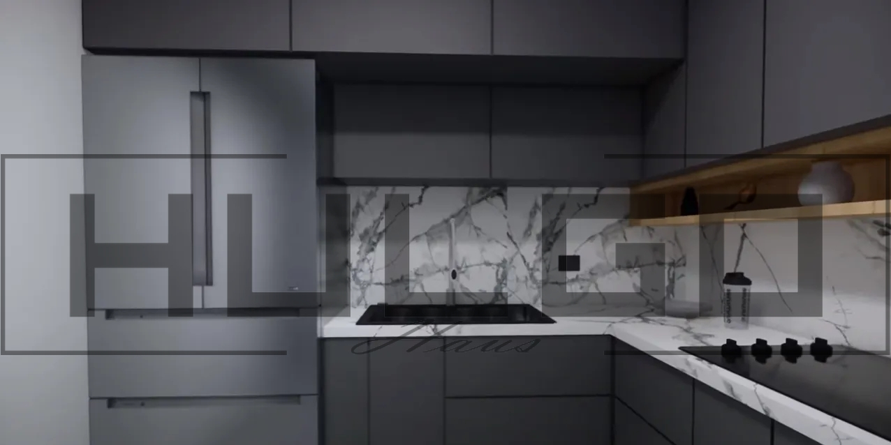 Bucătăria este complet echipată cu electrocasnice de ultimă generație și finisaje din materiale premium, cum ar fi blaturile din marmură și dulapurile din lemn natural. Spațiul generos permite o organizare eficientă, făcând din această bucătărie un loc ideal pentru gătit și socializare.