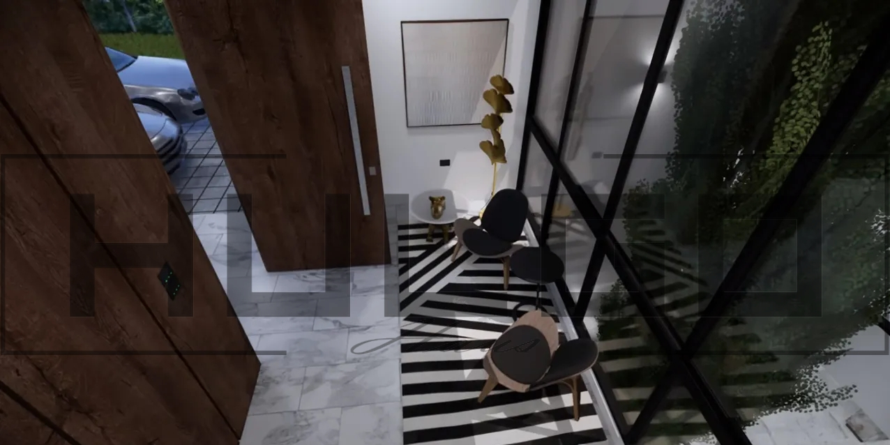 Fațada casei H009 impresionează printr-un design modern și spectaculos, cu elemente de sticlă, lemn și piatră care se îmbină armonios, subliniind caracterul exclusivist al locuinței. Ferestrele ample permit luminii naturale să inunde spațiile interioare și oferă o panoramă superbă asupra curții și împrejurimilor. Intrarea principală este marcată de un design impozant, cu detalii moderne și elegante, iar sistemul de iluminare exterioară evidențiază arhitectura impresionantă a casei pe timp de noapte.