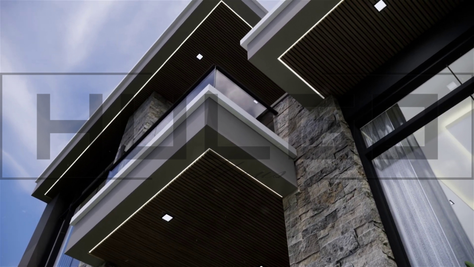 Fațada casei îmbină materiale naturale și elemente moderne, pentru un design sofisticat.