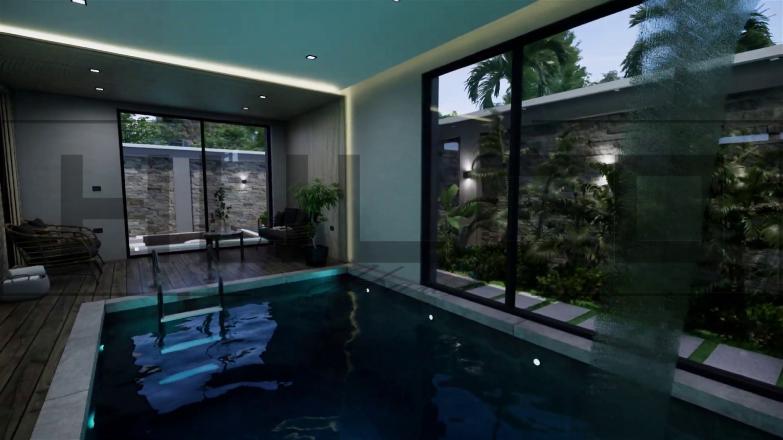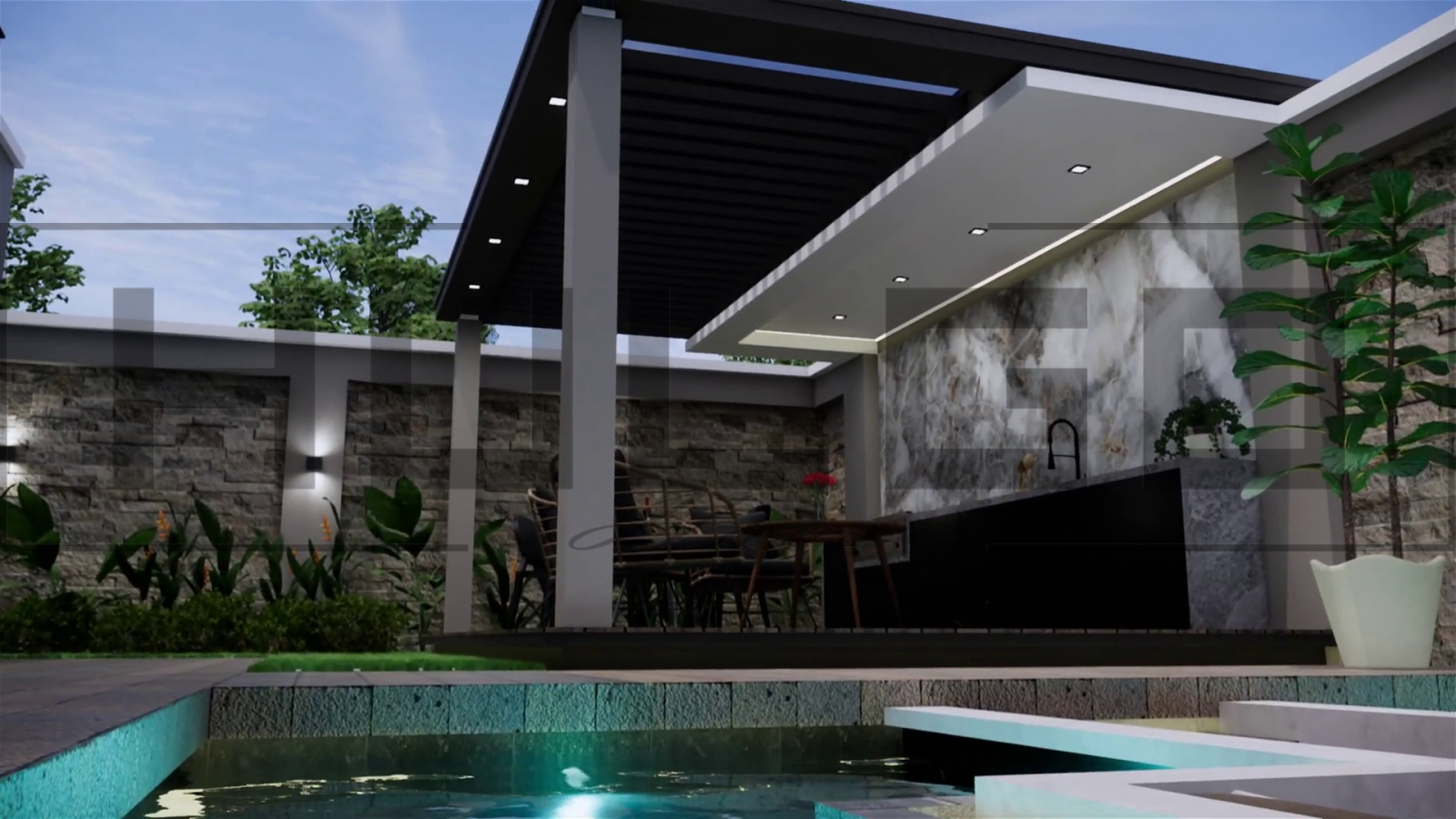 Terasa include o piscină privată, ideală pentru momente de relaxare sau socializare.